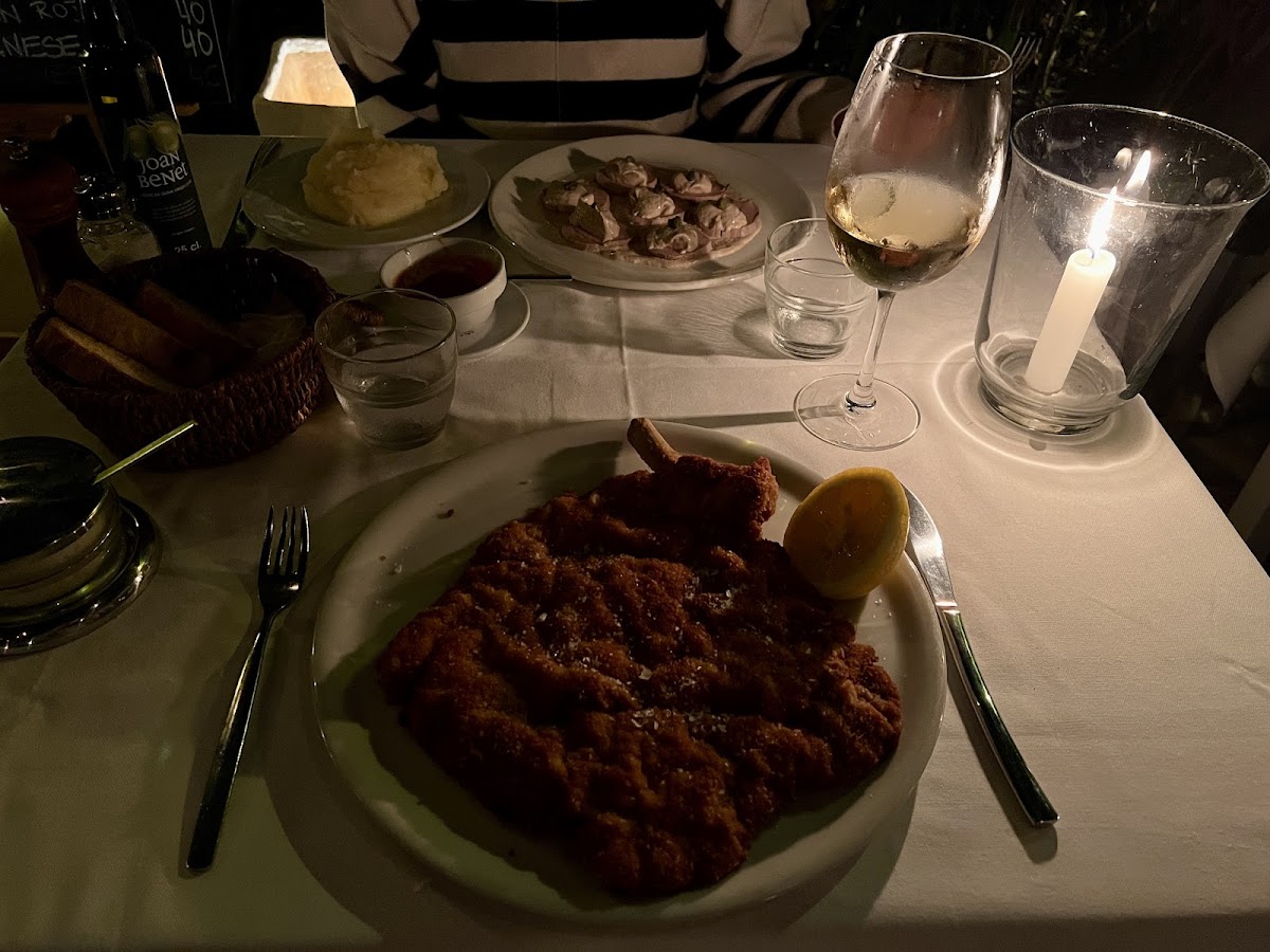 A beautiful setting with a very good menu covering all courses. Dinner outside suggested as it is particularly beautiful at night. Menu highlights were both the veal and the paccheri with bolognese which we didn’t order looked delicious. Service was although some errors, including sending us the paccheri by mistake (honestly we would have taken and paid for it ). We would’ve been happy to go twice on a 2 week trip.